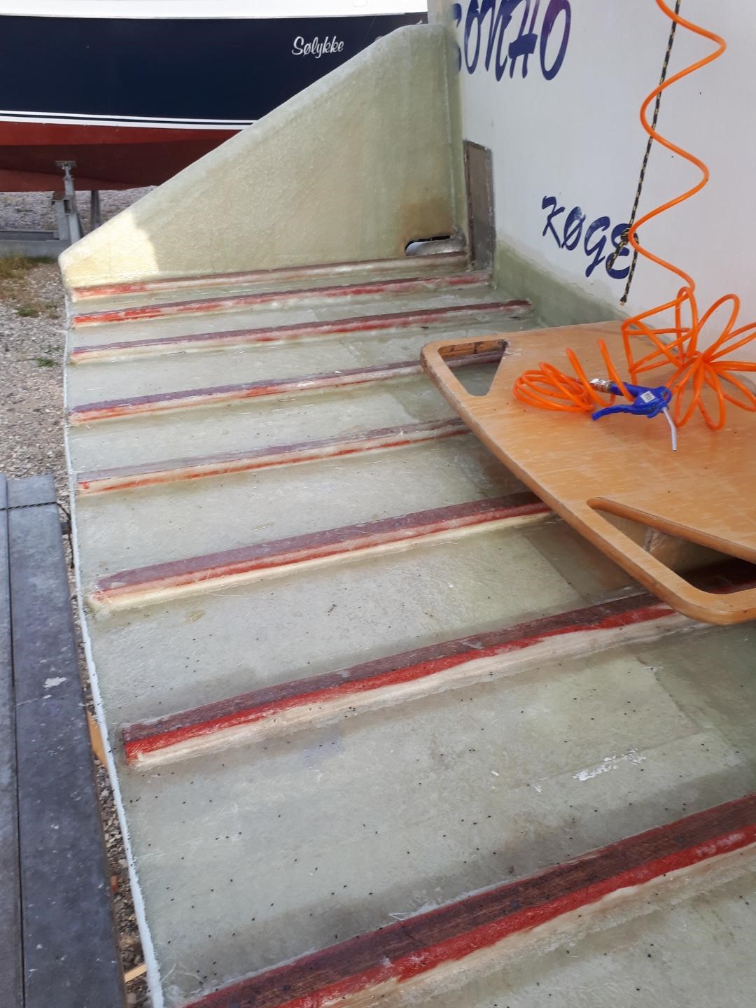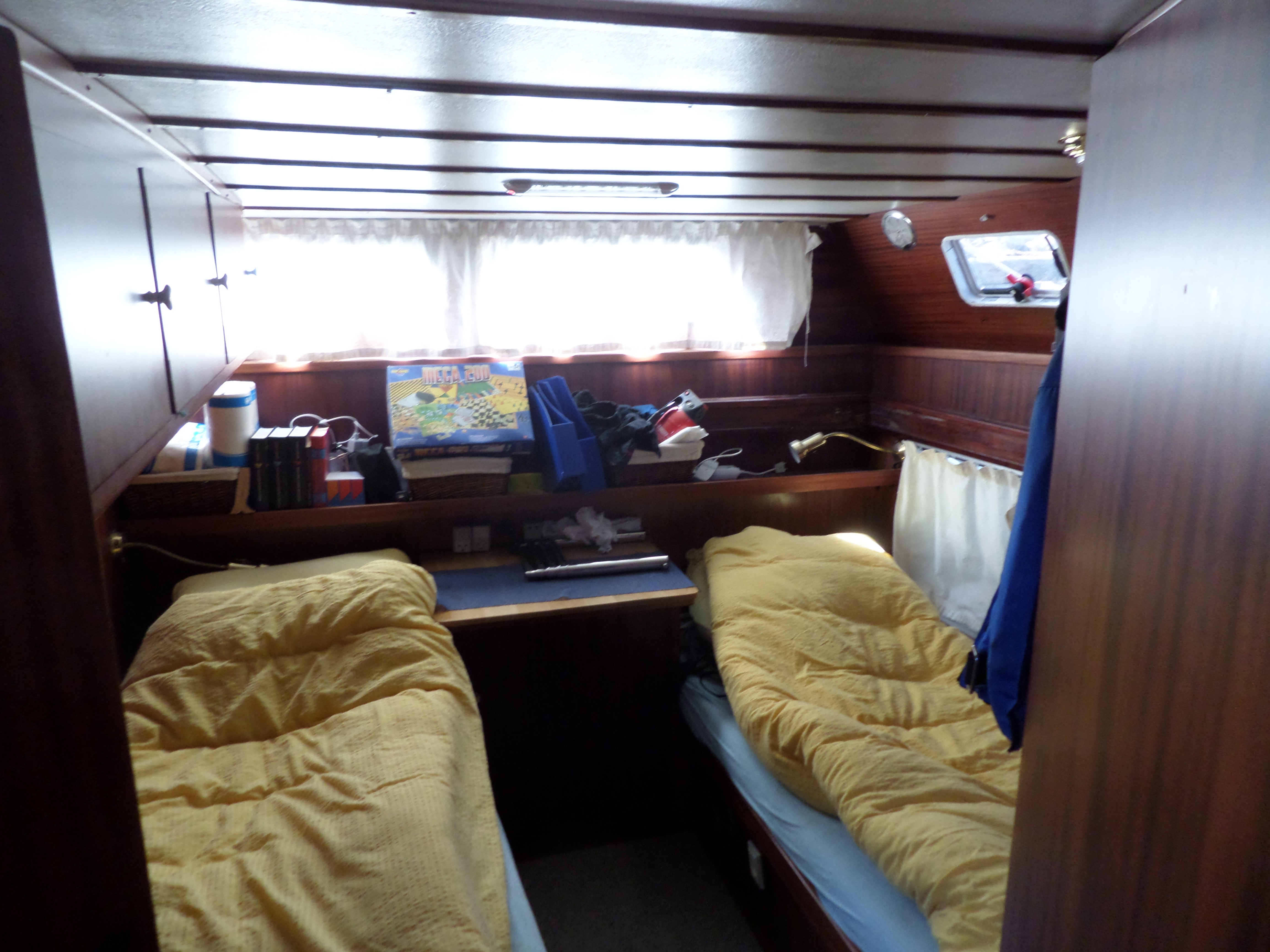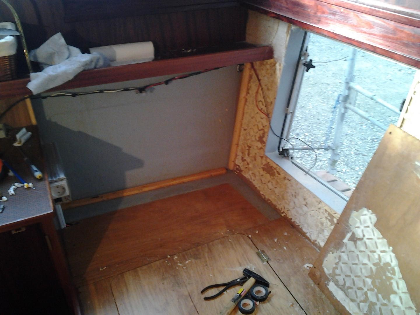 Vi startede i 2010 - 2011 , med at tage samtlige lofter ned , for at isolere , og så blev agterkahytten ændret , således at 3 køjer blev til 2 , samtidig satte vi vindue i hækken